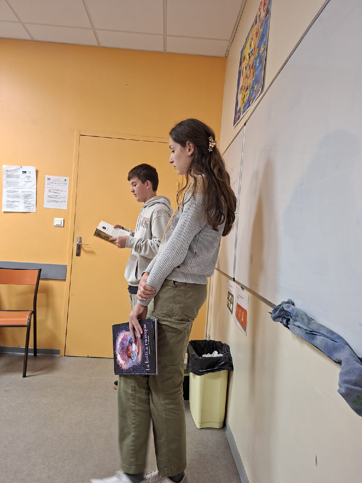 Ce soir, Léo et Maeva sont allés en cinquième pour interroger les élèves sur leurs pratiques de lecture, leurs goûts littéraires, leurs réticences à lire... Ainsi, les troisièmes connaîtront un peu plus les plus jeunes et pourront peut-être mieux s'adapter à leurs besoins et leurs envies.